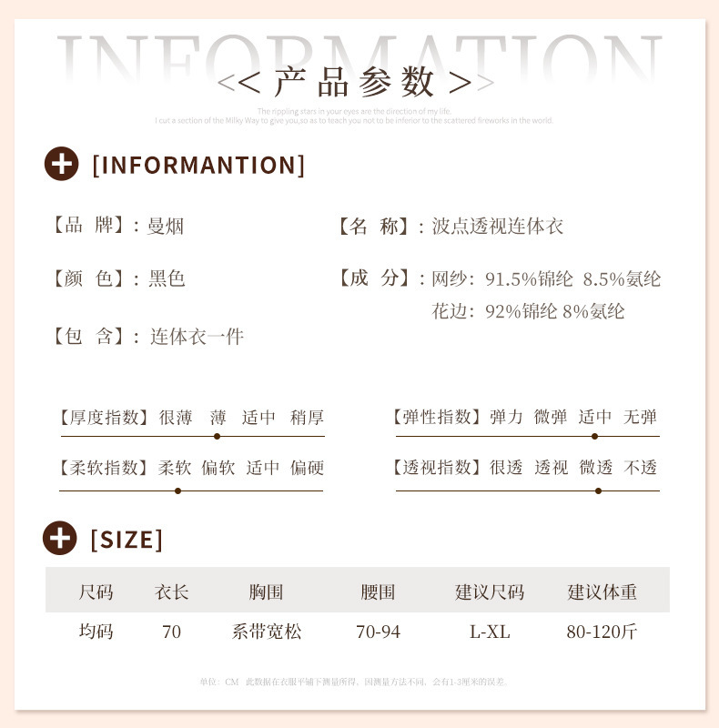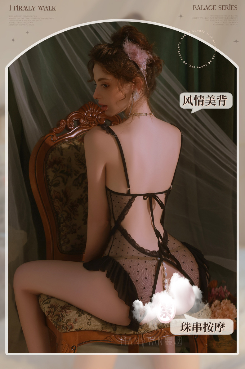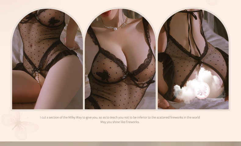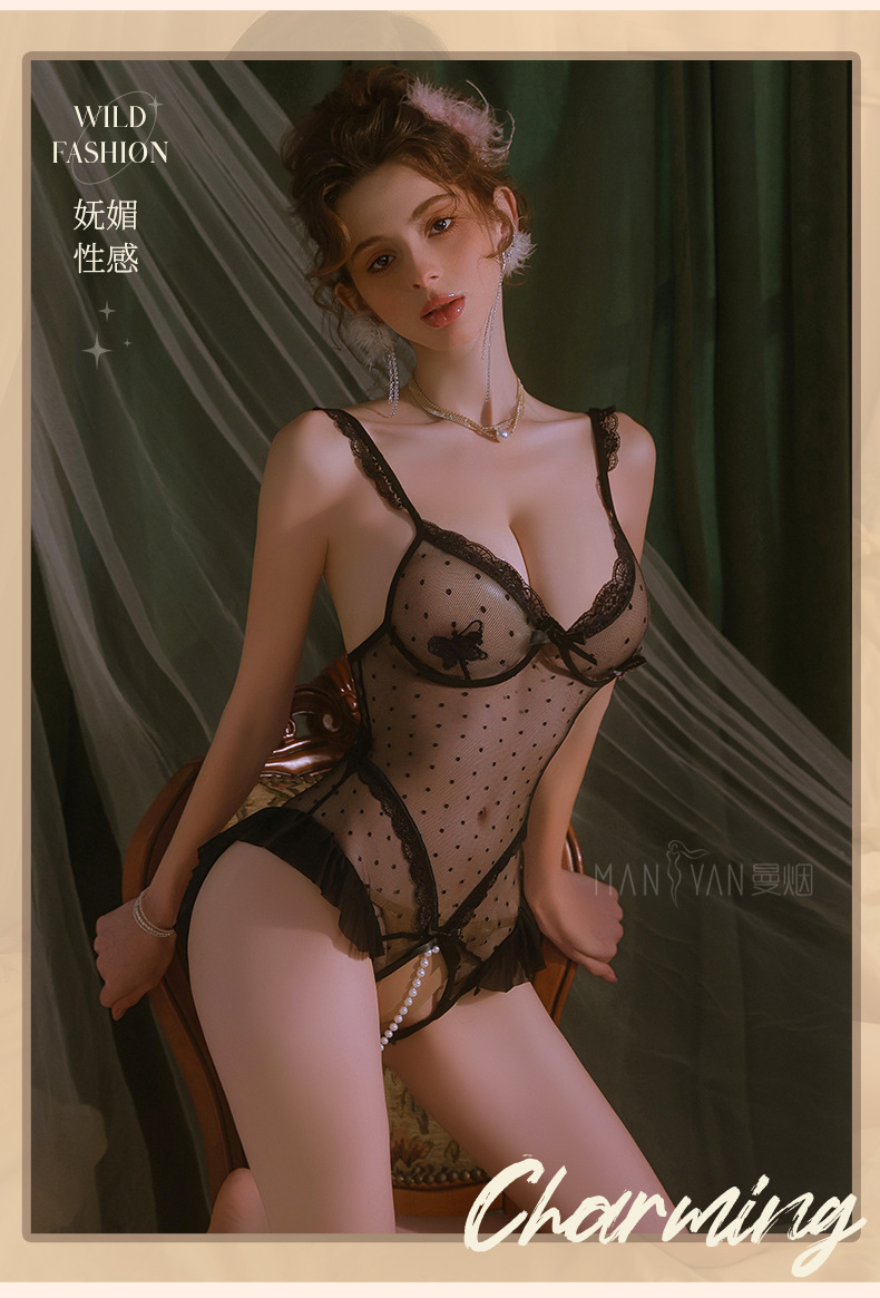 曼烟黑色性感情趣内衣女性感珠串开裆连体衣透视花边蝴蝶波点睡衣M0855不含袜子2465