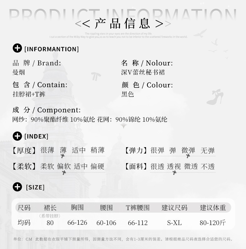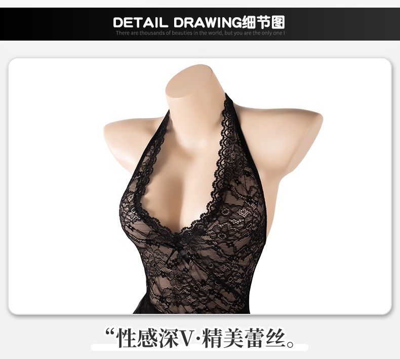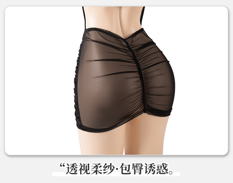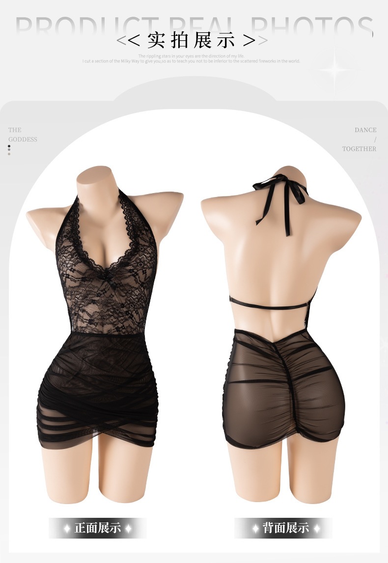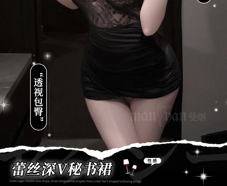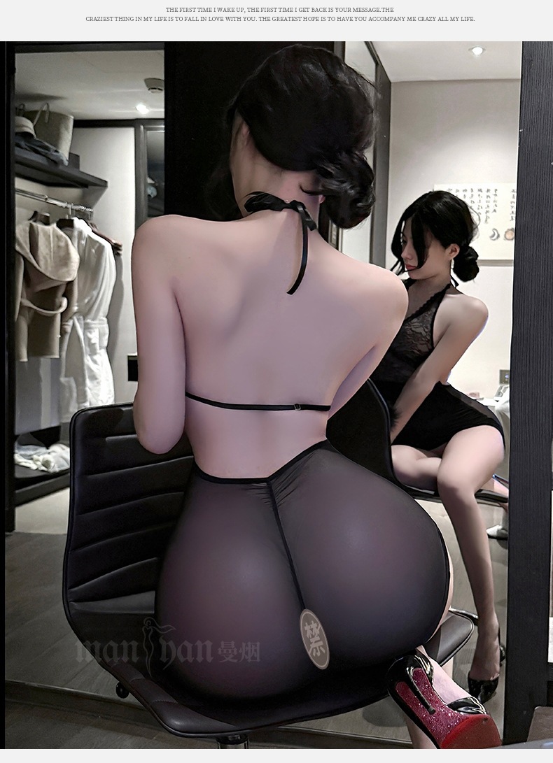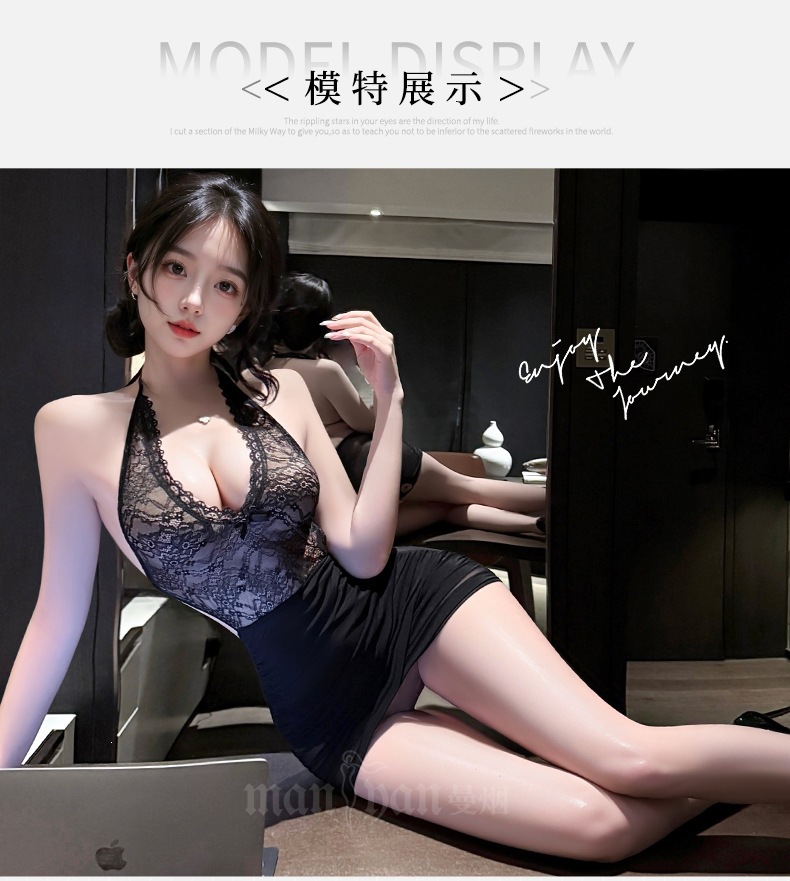 曼烟挂脖蕾丝透视女性感包臀裙纯欲诱惑ol秘书小助理战袍M1360黑色不含袜1件/袋7476