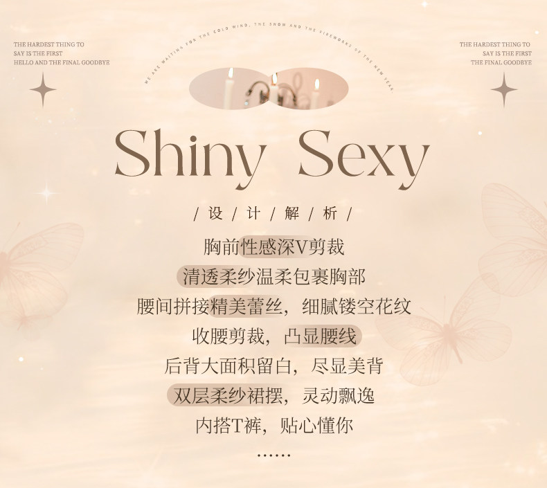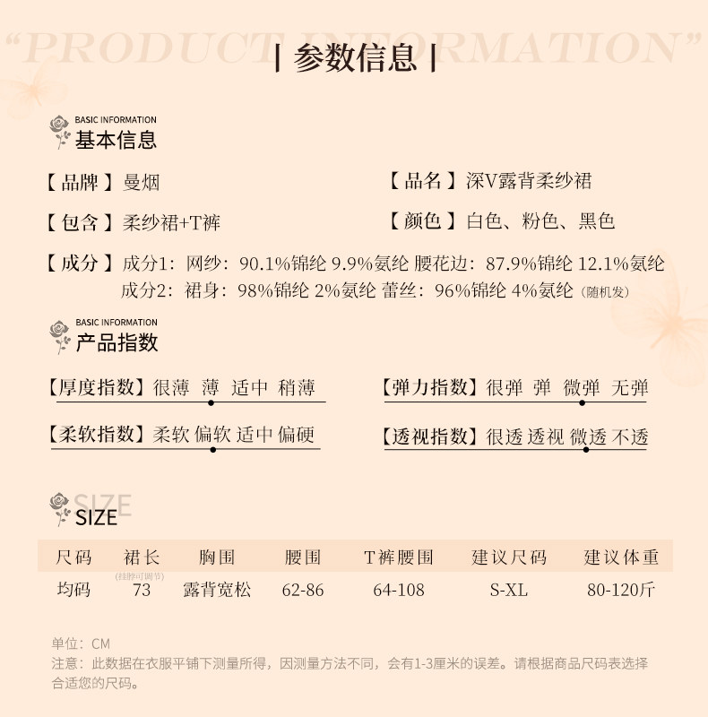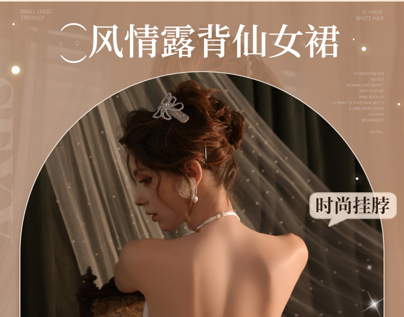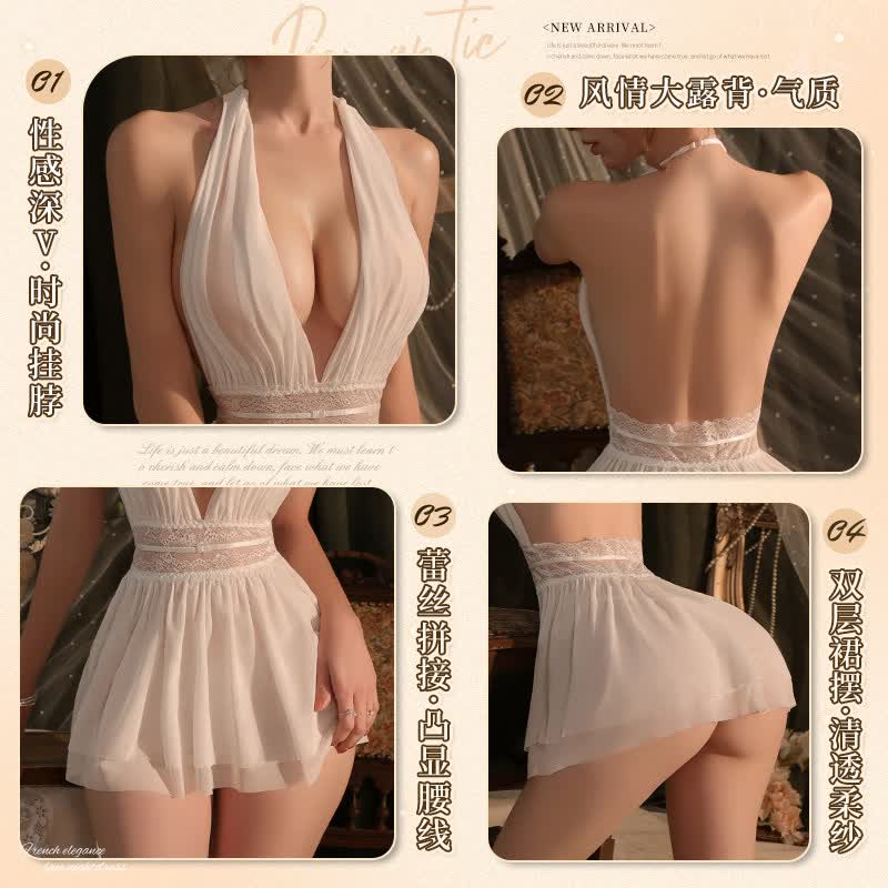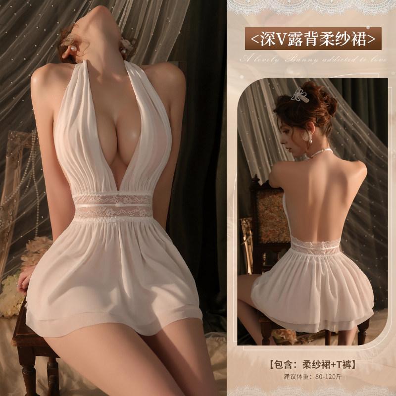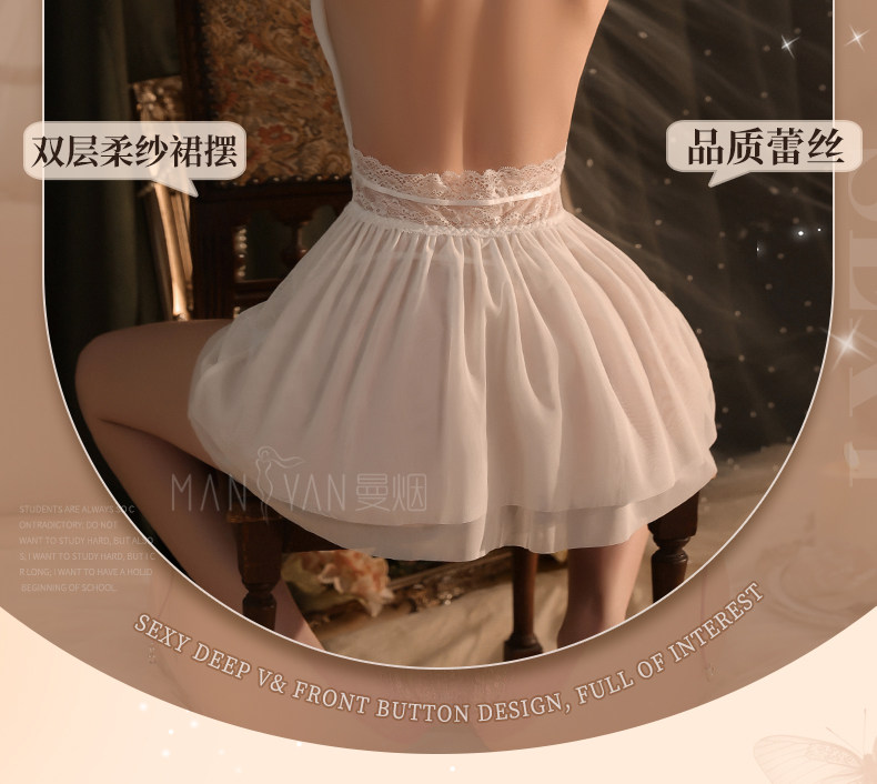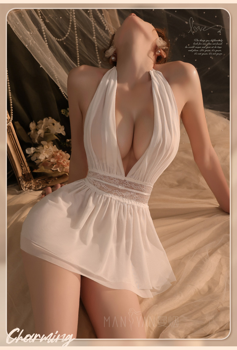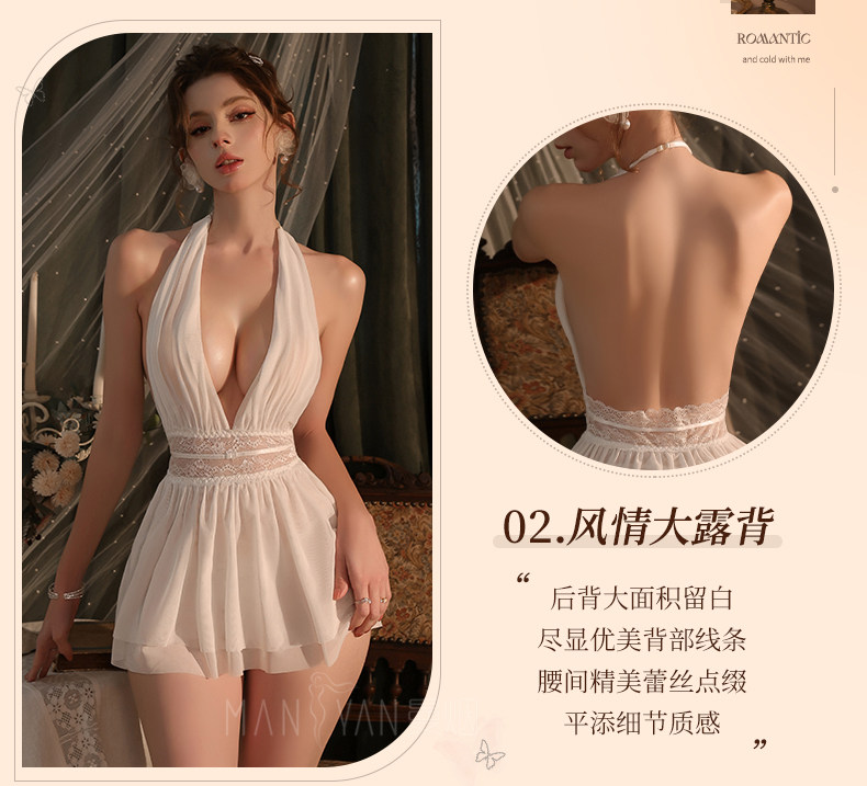 曼烟轻奢内衣性感吊带挂脖露背蕾丝收腰连衣裙柔纱透视纯欲M9864白色不含袜1件/袋7446